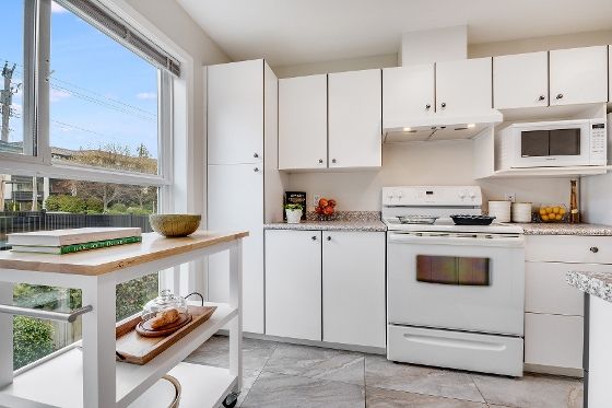 I brought in the cleaners for the soot on the window frames, windows, and even the dirty deck. I scrubbed kitchen cabinets myself, and ordered a product on Amazon to mix the porcelain colour, and repair the chips in the tub! I bought a new bathroom sink and shower head, as well as a new hood fan, and had the professionals install and repair. The flooring was chosen, and ordered, and paint applied... in many coats, I might add! The final touches of new lighting, and new door hardware made a huge difference... even down to replacing yellowed thermostats, and t.p holder! Attention to detail is key. I even ordered a cute white kitchen trolley with butcher block top for staging, and put it together myself! There was an empty spot by the windows in the kitchen that needed something.